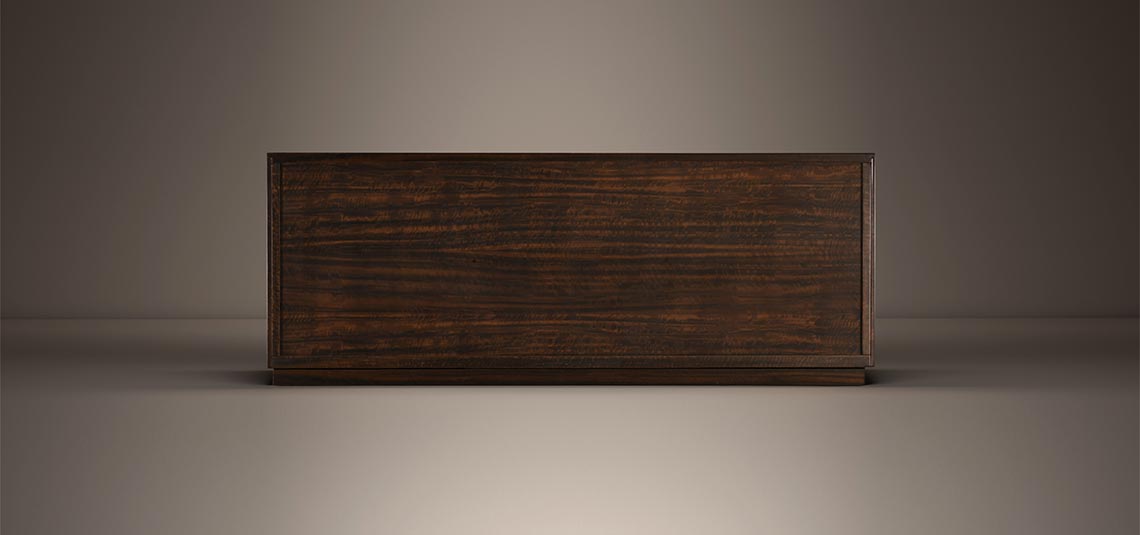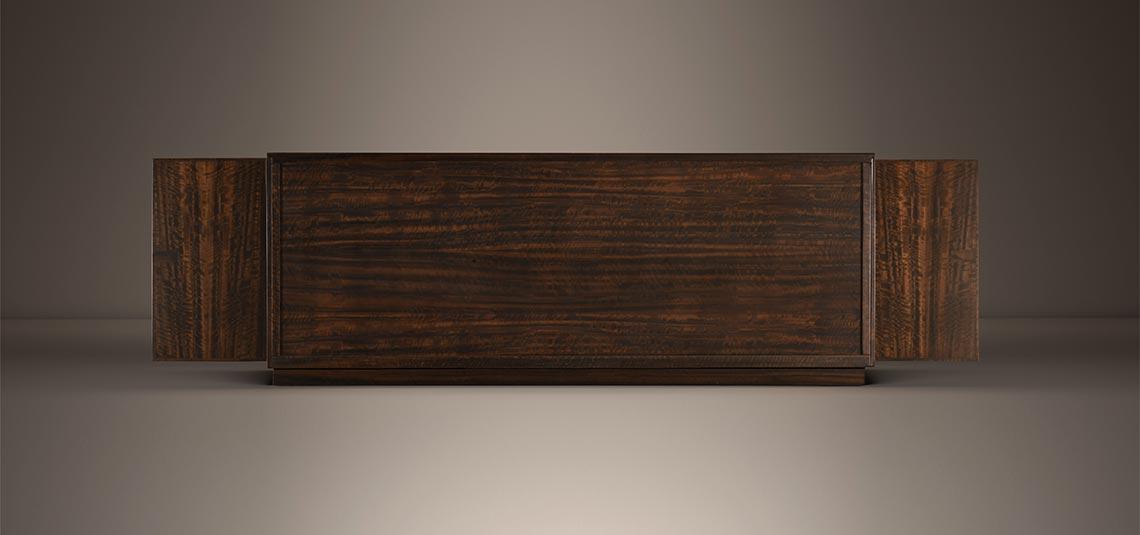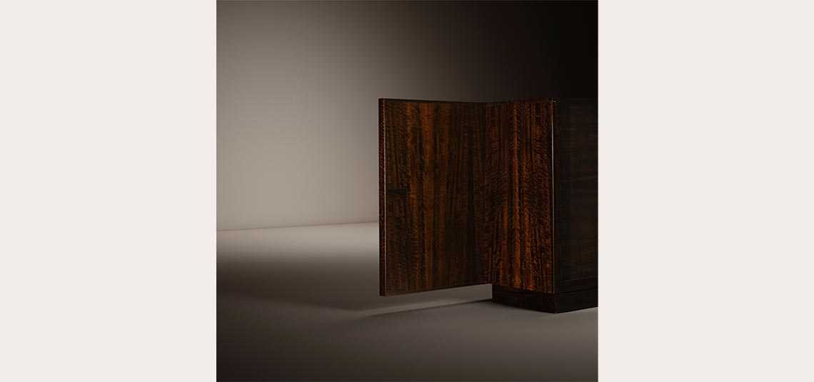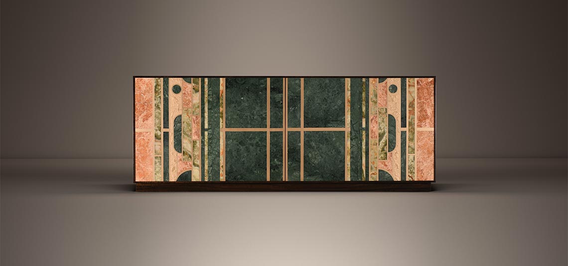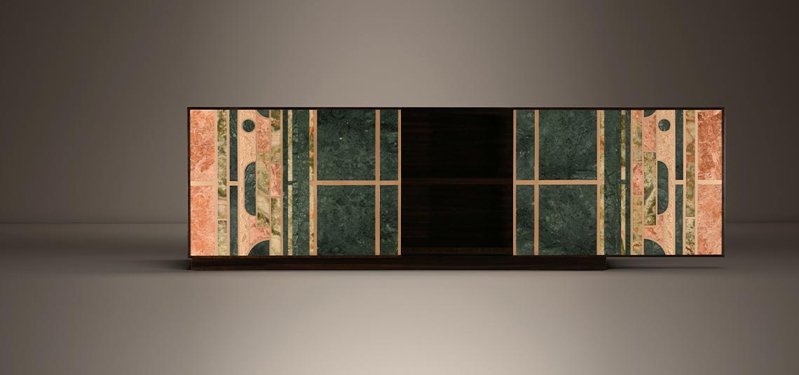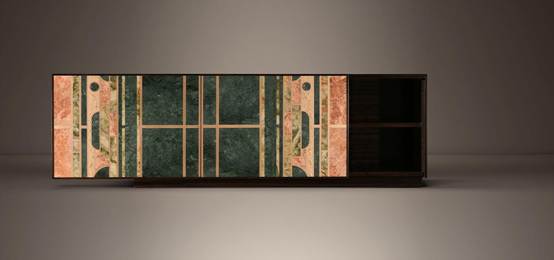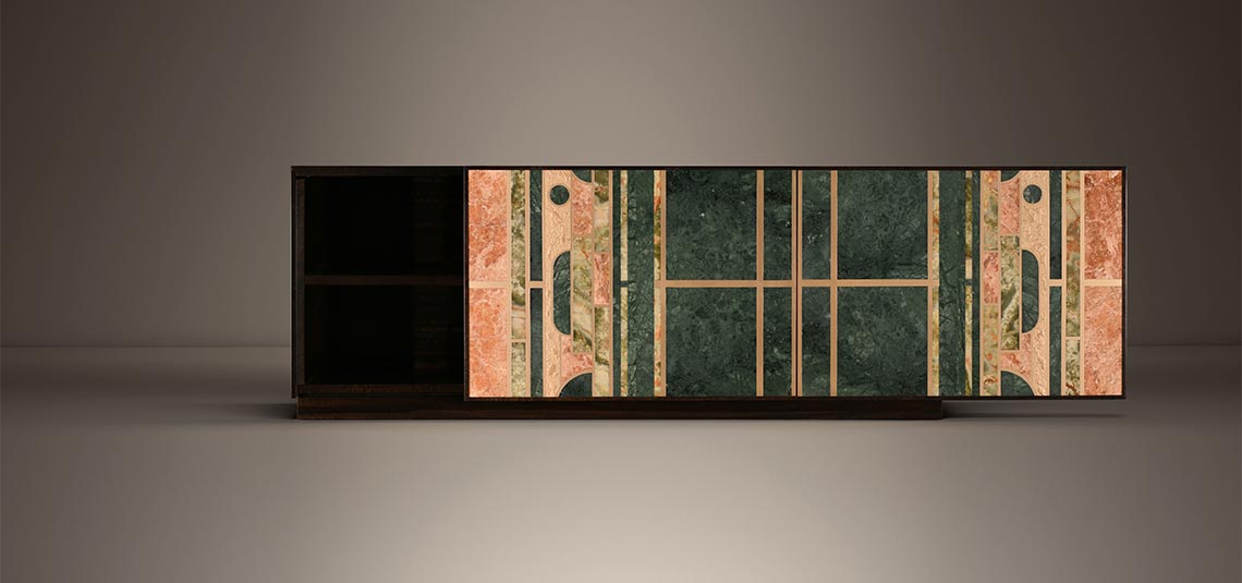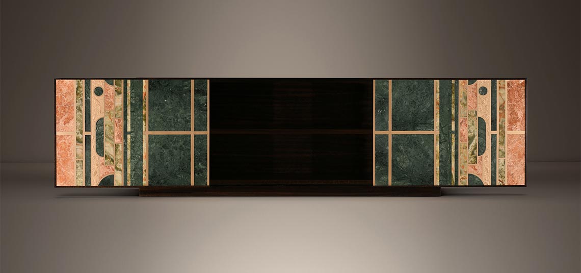 A glamorous celebration of urban life and fine craftsmanship in true art deco fashion, the «Persia» side cabinet is a one of one piece that follows early 20th century lifestyle principles of quality and exoticism through its use of artisanally fumed eucalyptus wood and a bespoke bidirectional sliding doors pulley that add to the timeless angular structure of the piece, while the door panels reinterpret the historic and opulent architectural visual element of marble surface inlay by using precious onyxes, marbles, and brass enamel in a contemporary design that shies away from traditional aesthetics while offering perennial appeal.